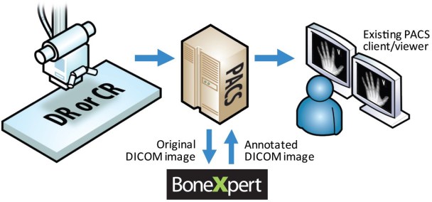 BoneXpert Server is installed on Windows PC or virtual machine in the hospital and connected to the PACS as a "DICOM node". This setup is performed by the local PACS administrator.
