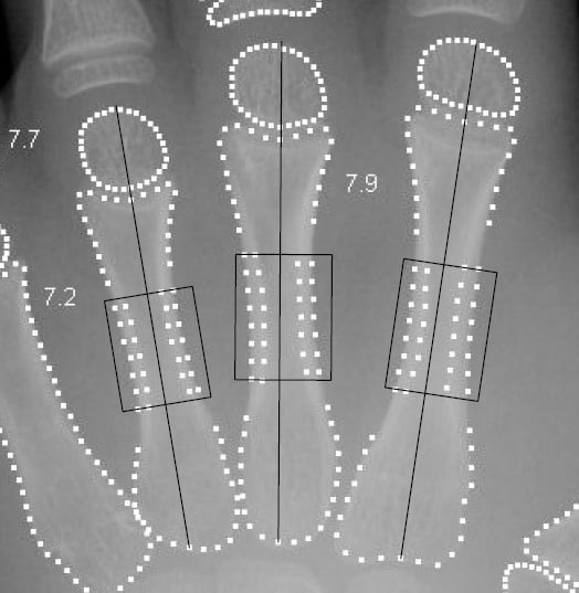 BHI is based on measurements of cortical thickness, T, in the three middle metacarpals. This is one of the oldest methods to assess bone mass, and it was popular in the 1960’s where T was measured directly on the X-ray films, typically in the middle of the second metacarpal. BoneXpert performs 100 independent measurements of T in three regions of interest (indicated to the right), thereby obtaining a much better precision than the old manual method.